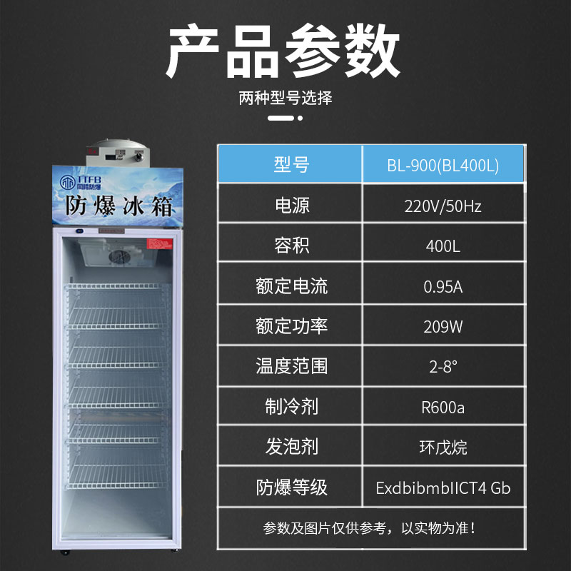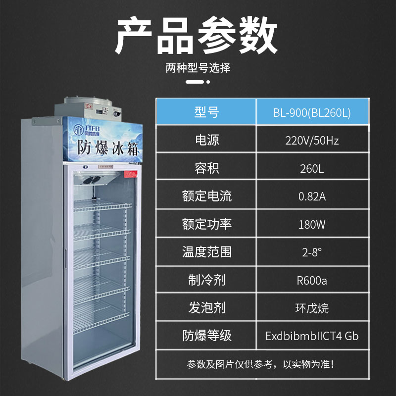 防爆冰箱產品類型有:防爆(雙門雙溫)冷柜,防爆(玻璃門冷藏)冷柜,防爆(超低溫)冷柜,防爆(臥式)冷柜,可廣泛使用于石油、化學化工 航天、實驗室、貯藏等部分具有ⅡC級,溫度組別為T4的性氣體混合物的l區(或2區)內部易爆風險性場所,BL系列工業級集成防爆冰箱,是選用集成防爆技術,按工業環境使用要求制作的ⅡC級防爆制冷系統。