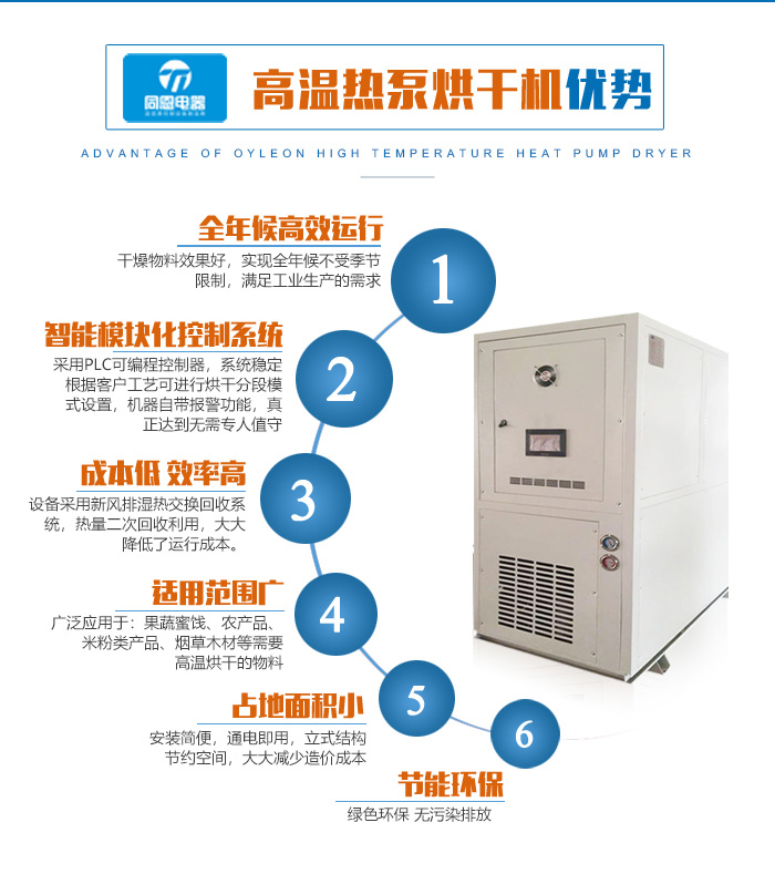 同恩牌熱泵干燥機采用谷輪或大金壓縮機,采用熱泵技術,節能脫水,使得干燥效率大大提高,特別是在高溫狀況下干燥物料,有很高的能效比
