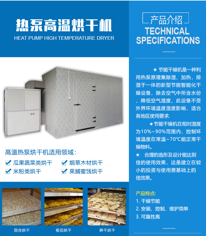 • 同恩牌熱泵干燥機是一種利用熱泵原理集除濕、加熱,排濕于一體的新型節能智能化干燥設備,來除去空氣中所含水份,降低空氣濕度,此設備不受外界環境溫度濕度影響,適合各地區使用要求。機器采用我公司回熱循環熱泵除濕方式,拓寬了除濕機在工業干燥領域的應用,干燥性能比普通熱泵除濕干燥節能30%以上,大大節約運行費用;中高溫干燥方式(常溫~70℃),接近自然干燥,被干物品的品質好、色澤好、產品等級高,無污染,而且***環保衛生要求。干燥過程中物料不變形、不開裂、不變色、不變質、不氧化、干燥徹底、干燥后復水性好、營養成分損失少,儲存期長,比任何傳統干燥設備更有效地保護干燥物的色、香、味、個體形態和有效成分。采用送風循環脫水并實現物料快速干燥。機組采用觸摸屏全自動控制方式(帶有溫濕度設定,機器故障顯示及工作模式和設定定時開關機、循環開關機以及時空模式等),性能穩定,操作方便。根據客戶需要,可設定不同干燥曲線,滿足不同種類物料干燥,具有適用范圍廣,干燥效果顯著,外形美觀,結構緊湊,功能齊全,運行寧靜,機組獨立放置在庫房外,易維護及操作,延長設備使用壽命。